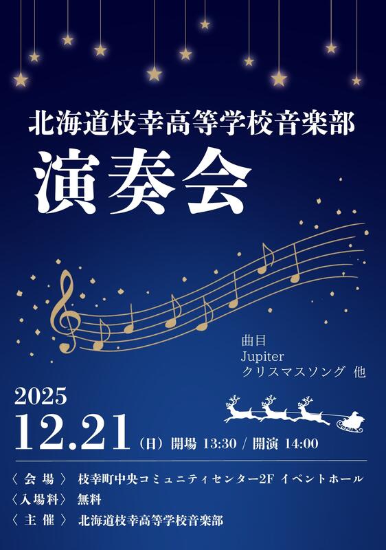 12月21日(日)に、枝幸町中央コミュニティセンター2階 イベントホールにて、本校音楽部の演奏会を行います。